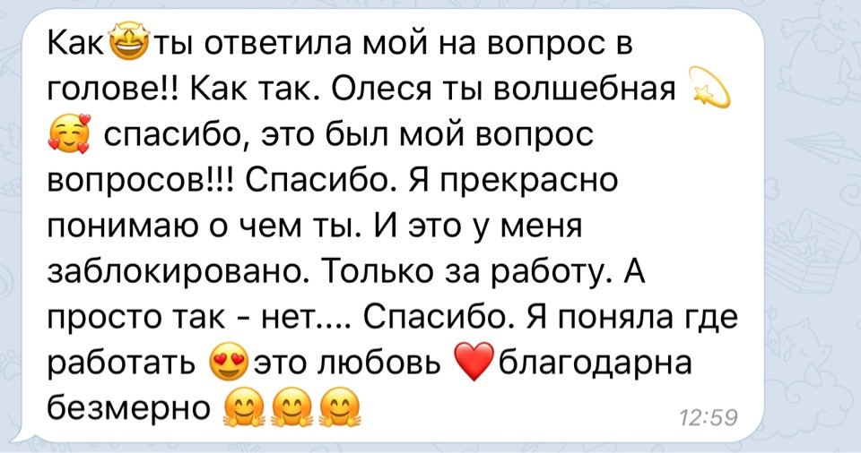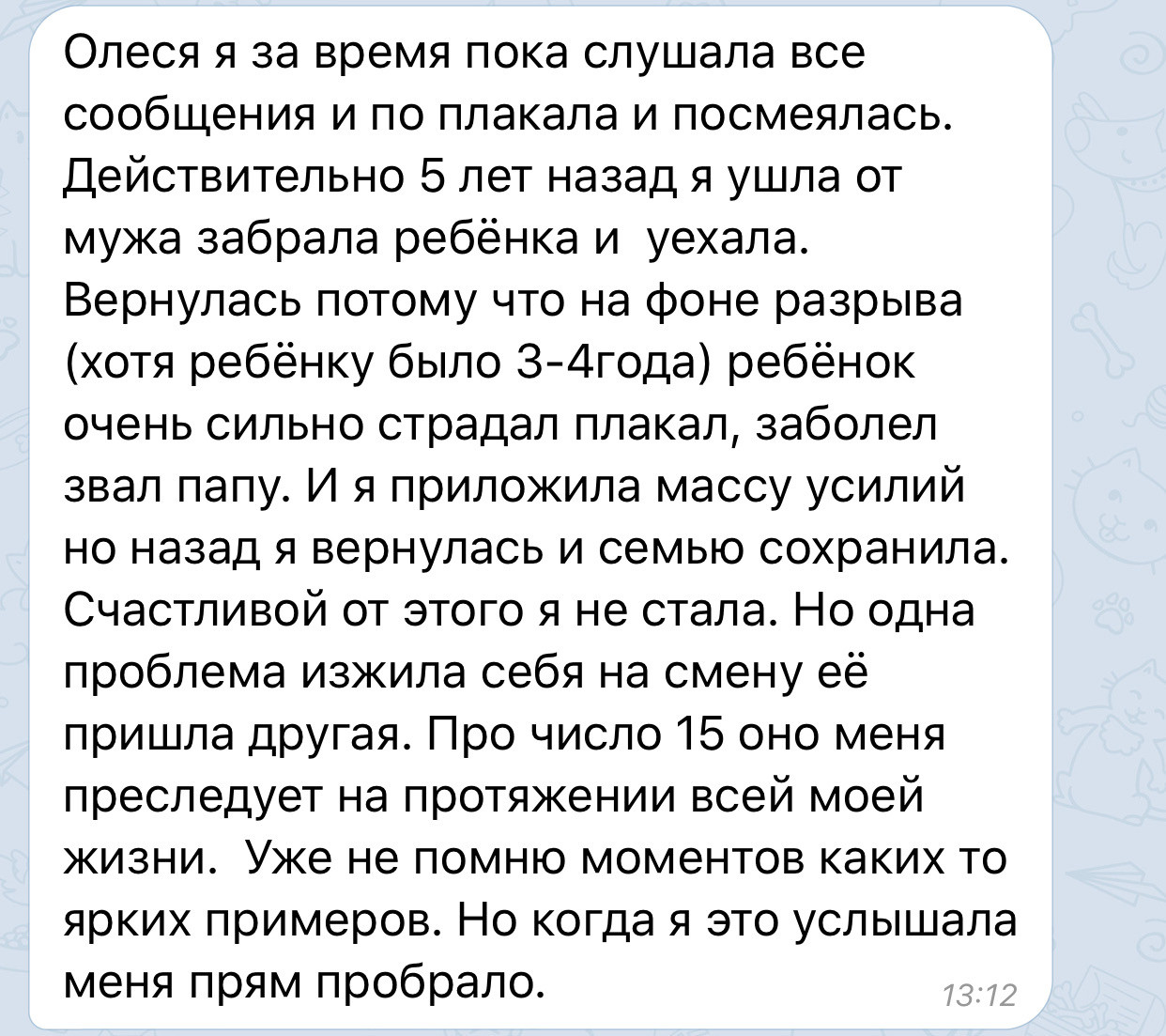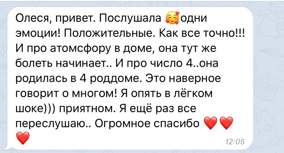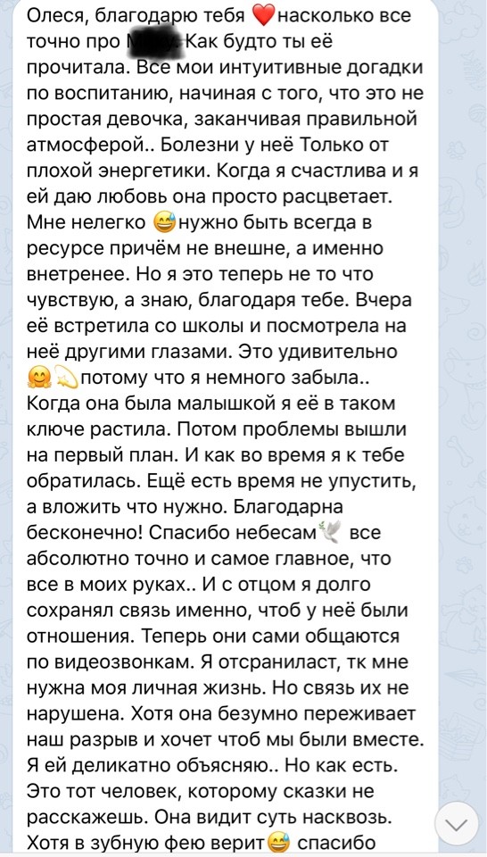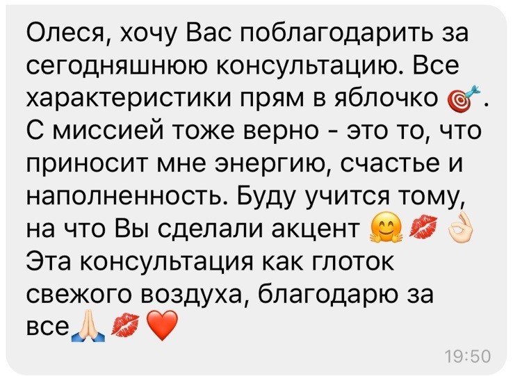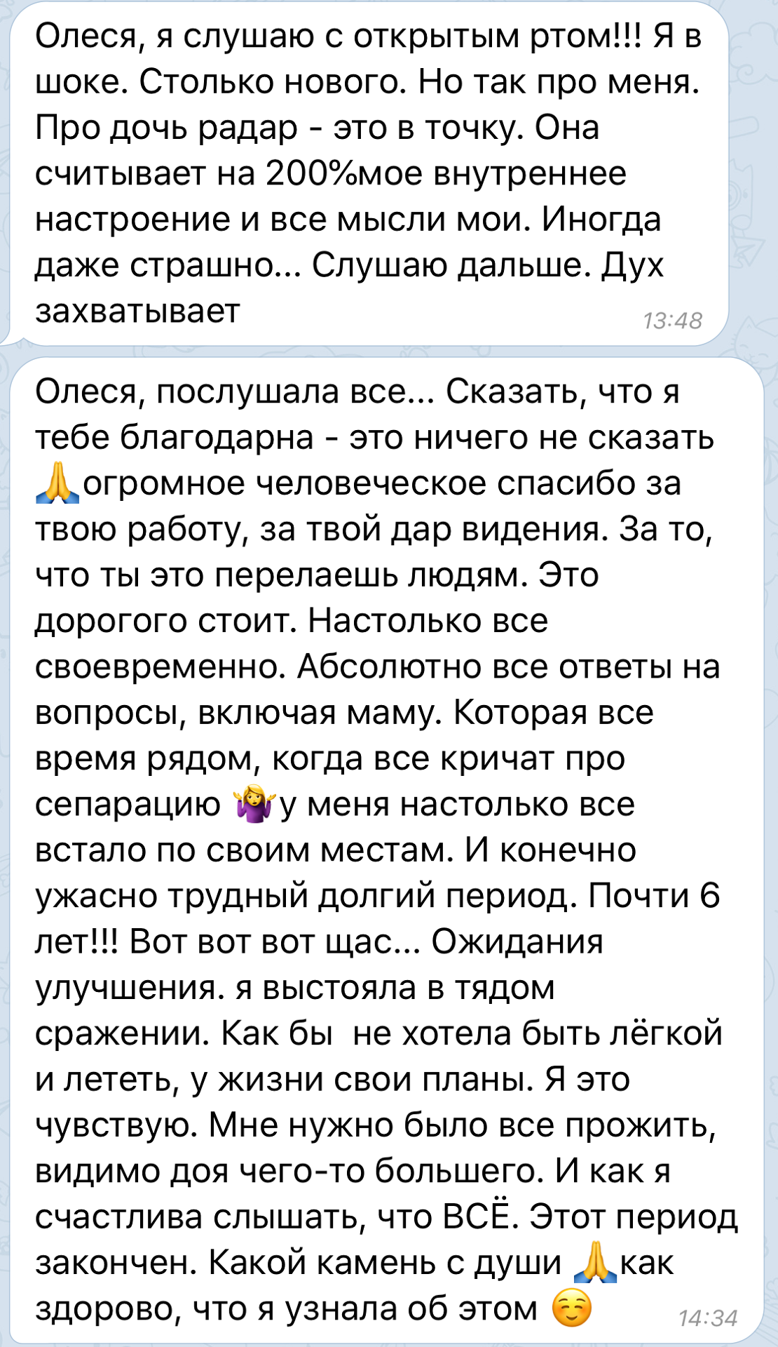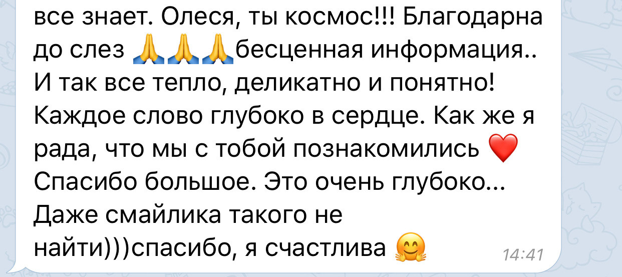 «Благодарю Олесю за консультацию по совместимости с партнером. Мы с мужем находились в затяжном кризисе и не могли найти точки развития. Олеся мне объяснила все «подводные камни» в наших отношениях и как двигаться дальше…к своей идеальной семье! Олеся спасла наш брак!»