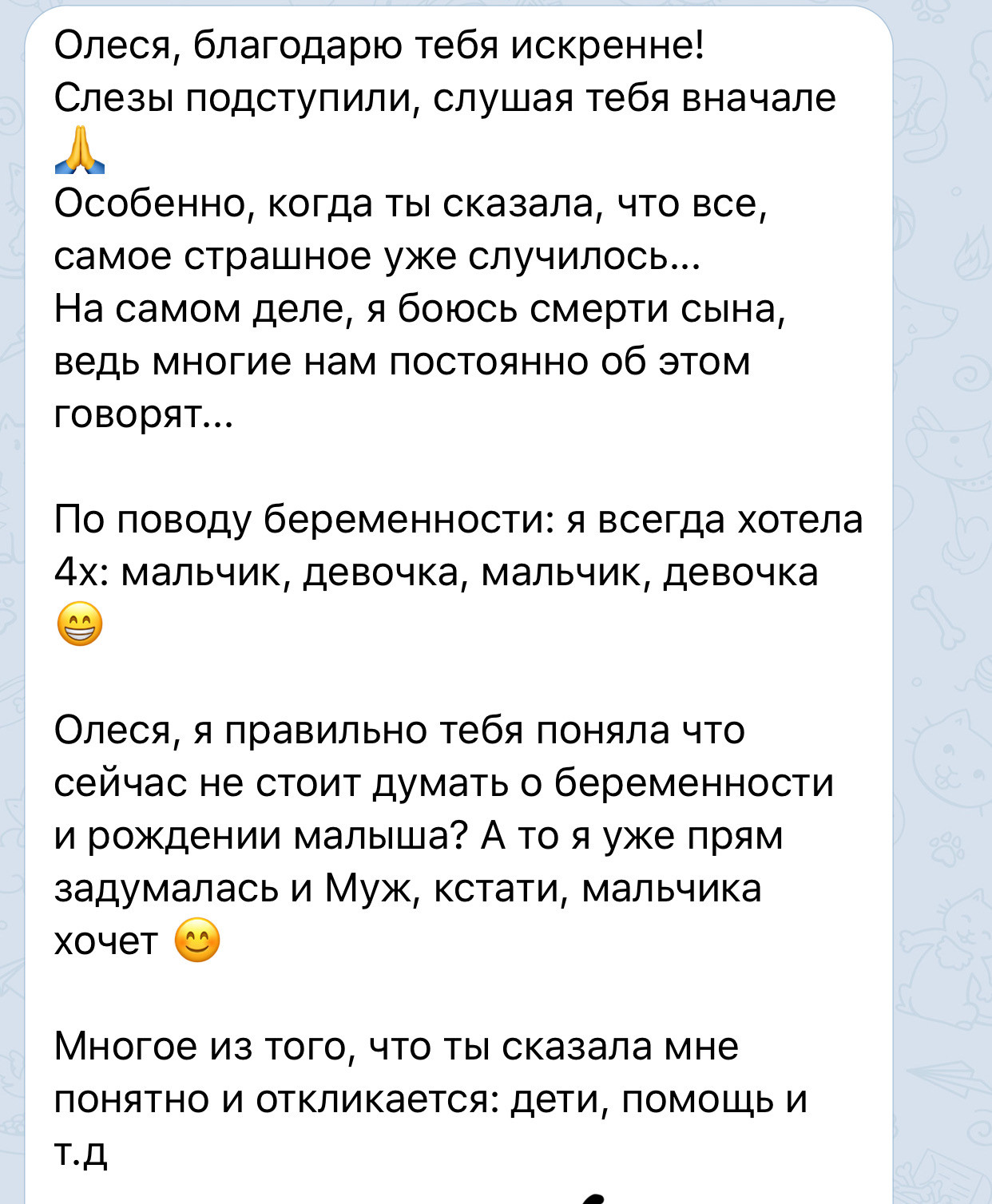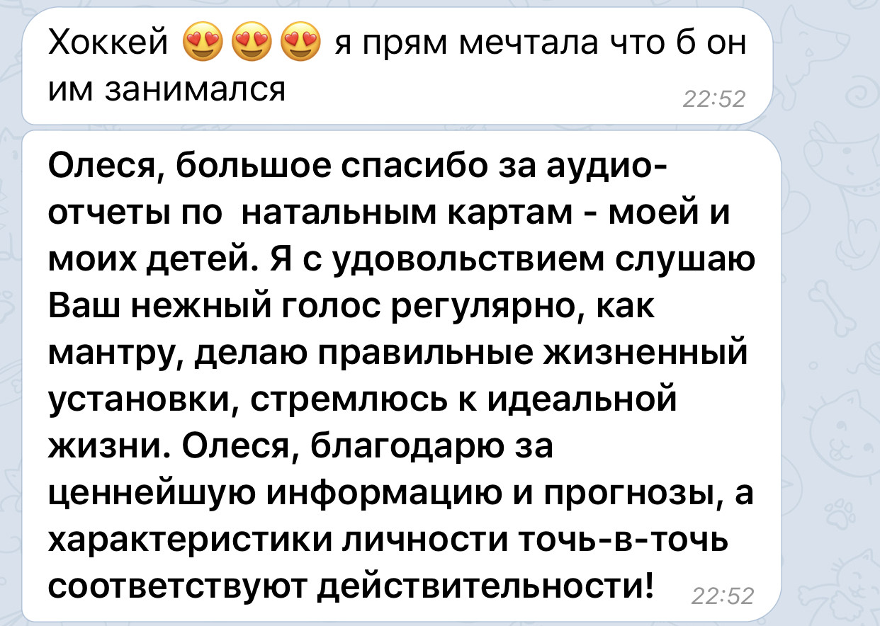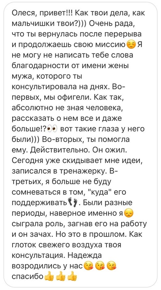 «Я к Олесе обратилась за консультацией по рекомендации своей подруги, которая была просто в восторге! Меня интересовала реализация моего старшего сына. Я не могла понять куда направить моего 10-ти летнего сына, где он может добиться успехов, и что будет ему очень нравиться. Олеся подробно рассказала про характер сына, где у него будут максимальные успехи и куда его можно отправить учиться! Я в восторге от консультации!»