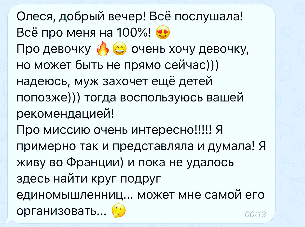 «Моей дочке всего годик, но я уже задумалась над ее талантами. Я очень хотела дочку отдать в гимнастику, и Олеся увидела ее таланты в большом спорте и творчестве. Рассказала о важных годах жизни моей малышки. И теперь у меня есть четкий и понятный план по воспитанию дочки, а главное все то, что рассказала Олеся, важно знать каждой маме! Спасибо, спасибо, спасибо!»